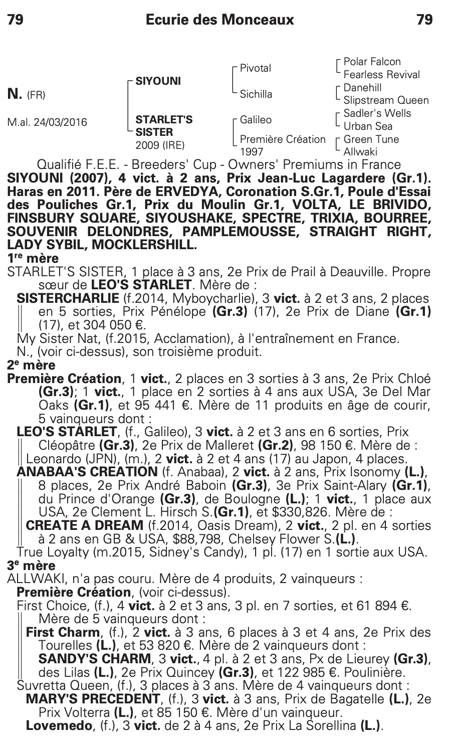 His sire, Siyouni, is the top sire in France (number 1 by the earnings of his offspring). He was bred by His Highness the Aga Khan, and serves in his stud farm of Haras de Bonneval for €100,000 ... while he started his stud career at a mere €7,000. His offspring is so good that his covering fee was raised significantly and he is currently the most expensive on duty in France ... and certainly the most requested too!