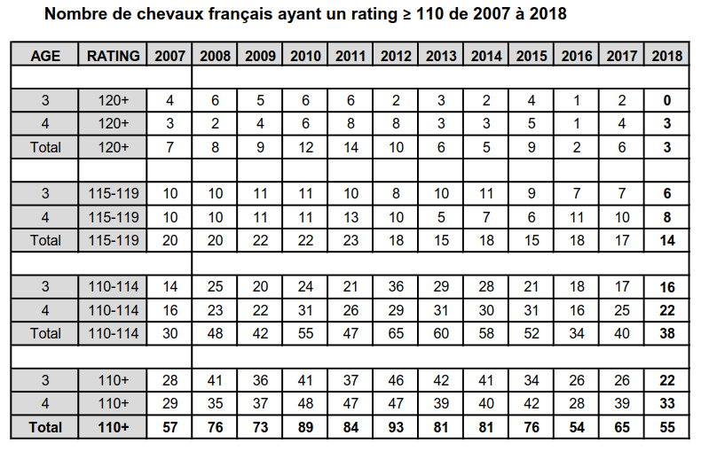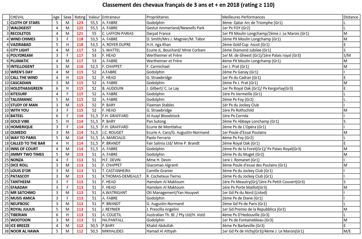 Waldgeist (Galileo) est deuxième avec un rating de 122 suite à sa victoire dans le Qatar Prix Foy (Gr3). Recoletos (Whipper) affiche un rating de 121. C’est le troisième et dernier cheval français ayant un rating supérieur ou égal à 120 grâce à sa deuxième place du Prix du haras de Fresnay-le-Buffard Jacques le Marois (Gr1) et à sa victoire dans le Prix du Moulin de Longchamp (Gr1).