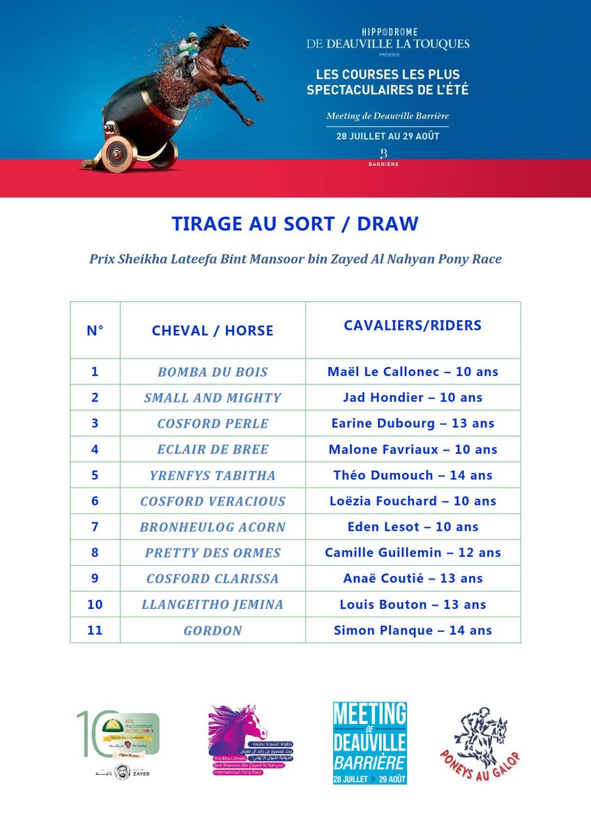 La deuxième course programmée à Deauville le 5 août servira de sélection pour cette finale aux Émirats. Les cavaliers sélectionnés pour cette course sont âgés de 10 à 14 ans et ils font partie des meilleurs en France en 2018 (classement FFE). Les montes sont tirées au sort pour préserver le suspense et donner sa chance à chacun. Les poneys sont sélectionnés pour leur homogénéité (taille et qualité) et leur maniabilité pour pouvoir être montés indifféremment par tous les cavaliers. Le cavalier ou la cavalière gagnant sera invité une semaine tous frais payés avec ses parents à Abu Dhabi. L'enjeu est donc d'importance pour les participants comme pour leurs parents !