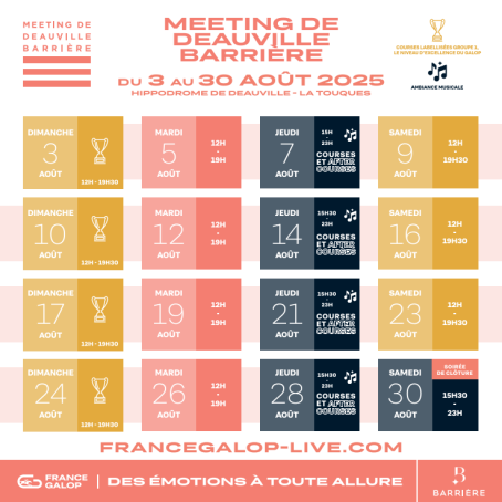 Le programme sportif du Meeting est particulièrement relevé avec une concentration de 7 courses de Groupe 1, le niveau d’excellence du Galop mais aussi 5 courses de niveau Groupe 2 et 11 de Groupe 3. Durant le mois d’Aout, l’Hippodrome de Deauville attire les meilleurs chevaux d’Europe pour disputer les épreuves du Meeting de Deauville Barrière.De nombreuses animations gratuites pour les petits et les grands seront installées sur l’hippodrome pour toute la durée du Meeting, les structures gonflables, les baptêmes à poneys, les séances dédicaces des jockeys, une grande piscine à balles et bien d’autres…