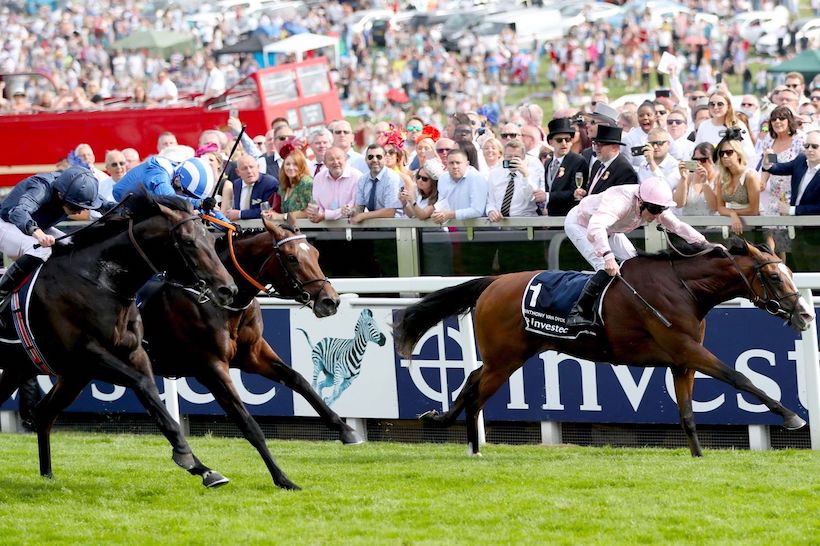 Motamarris avait gagné trop facilement ses trois premières courses pour que sa valeur puisse être clairement définie. Nous avons choisi de nous appuyer sur le rating atteint par Persian King dans The Emirates Poule d’Essai des Poulains (Gr1), à savoir 116, pour coter la course. Sottsass atteint ainsi 120, Persian King reste à 116, Motamarris est à 112 et Cape of Good Hope à 111. C’est cinq livres de plus que Study of Man l’an dernier et le deuxième meilleur rating de ces dix dernières années : seul Lope de Vega avait fait mieux, en 2010, avec un rating de 124. Cette valeur est de deux livres supérieure à celle obtenue par Anthony van Dyck (Galileo), vainqueur d’une arrivée très groupée du Derby d’Epsom (Gr1, photo ci-contre), ce qui est rarement la garantie d’une grande qualité.