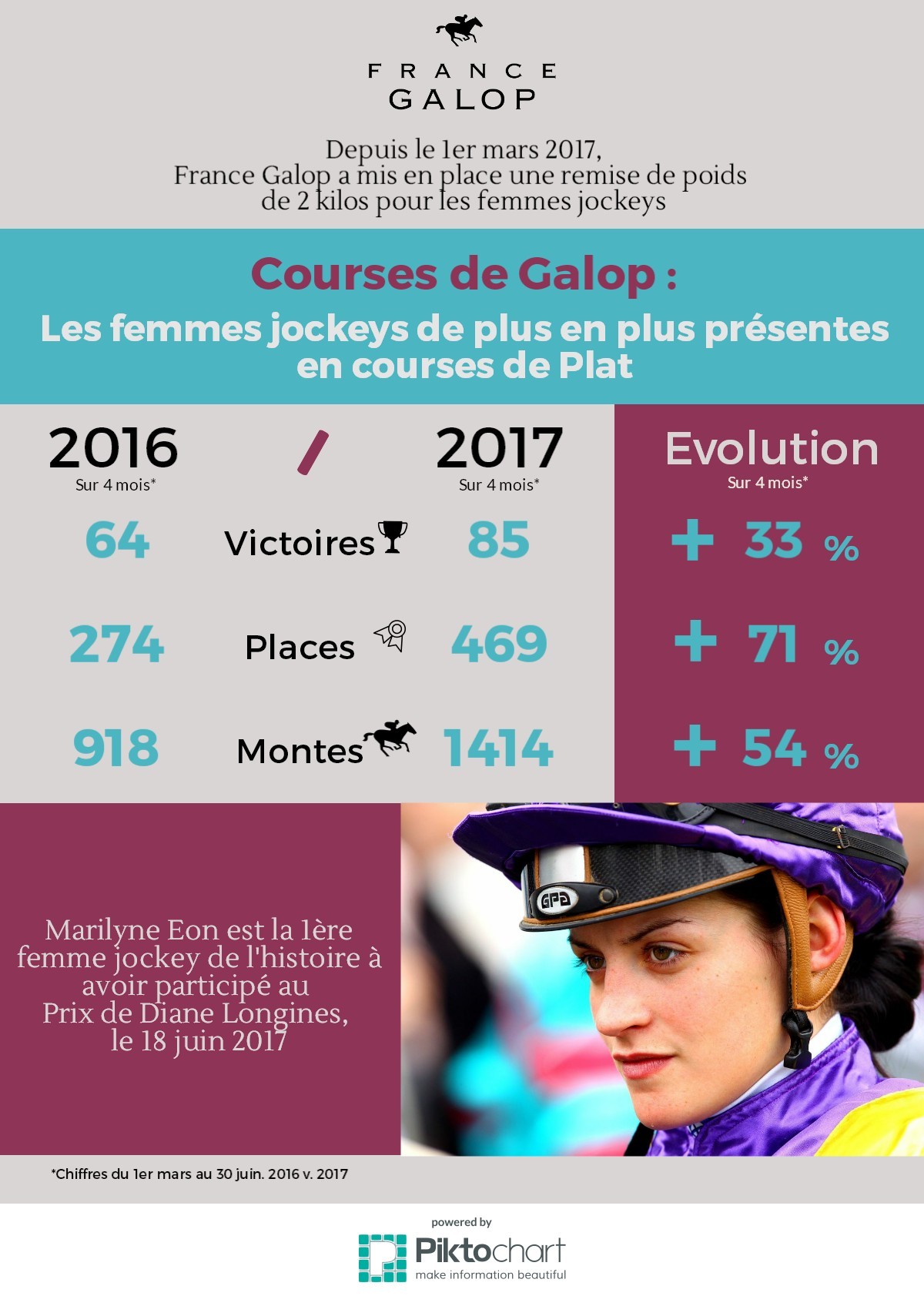 Le soir du Grand Prix de Vichy (Gr3), mercredi 19 juillet, quatre courses sont revenues à des femmes-jockeys : Elaura Cieslik (deux fois), Margot Romary et Maryline Eon, qui avait déjà défrayé la chronique un mois plus tôt en devanant la première femme au départ du Prix de Diane Longines (Gr1). Au terme des cinq jours du meeting des Bords de l'Allier, six victoires ont été signées par des femmes, et les premiers résultats depuis la mise en place de la décharge de deux kilos aux cavalières sur l'ensemble du pays a donné des résultats probants, comme en témoigne l'infographie ci-contre.
